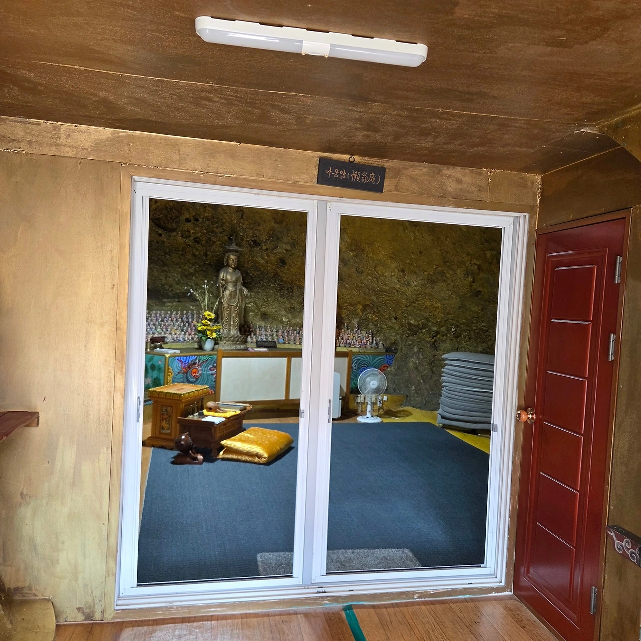 이곳에서 고금당으로 방향을 잡았다. 고금당은 옛 금당사라고 이해하면 될 것이다. 그곳에 있는 현수막 산문이 이채롭다. 예전 등산길은 폐쇄되고 고금당으로 가는 길이 활성화되어 있습니다. 예전 등산길은 생태 복원 중이었다. 암마이봉에서 보면 금빛이 나는 지붕이 있다. 그곳이 고금당이다. 그곳에 천연 굴이 있고 그곳에 암자가 있다. 그리고 그곳에서 바라보는 경치가 일품이다. 암마이봉이 있고 봉두봉이 있으며, 비룡대가 좌측에서 지키고 있다. 멀리 팔공산이 우측에서 지키고 있다. 팔공산은 구름 속에 있다.