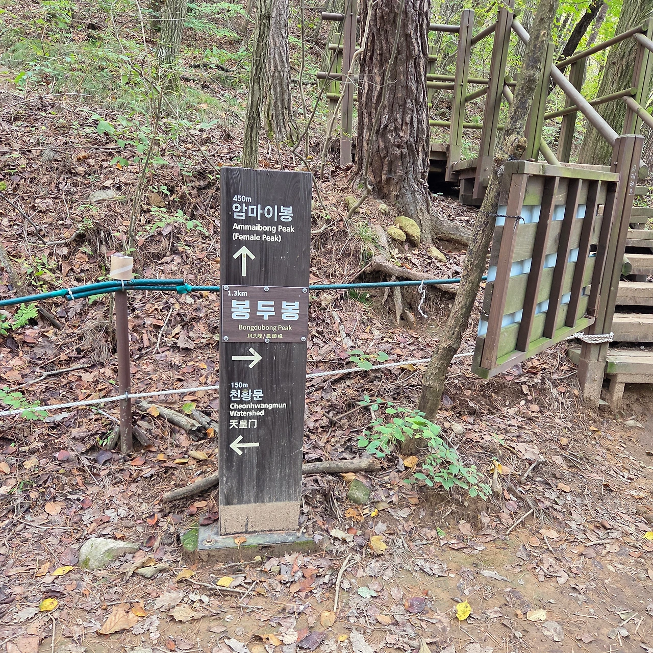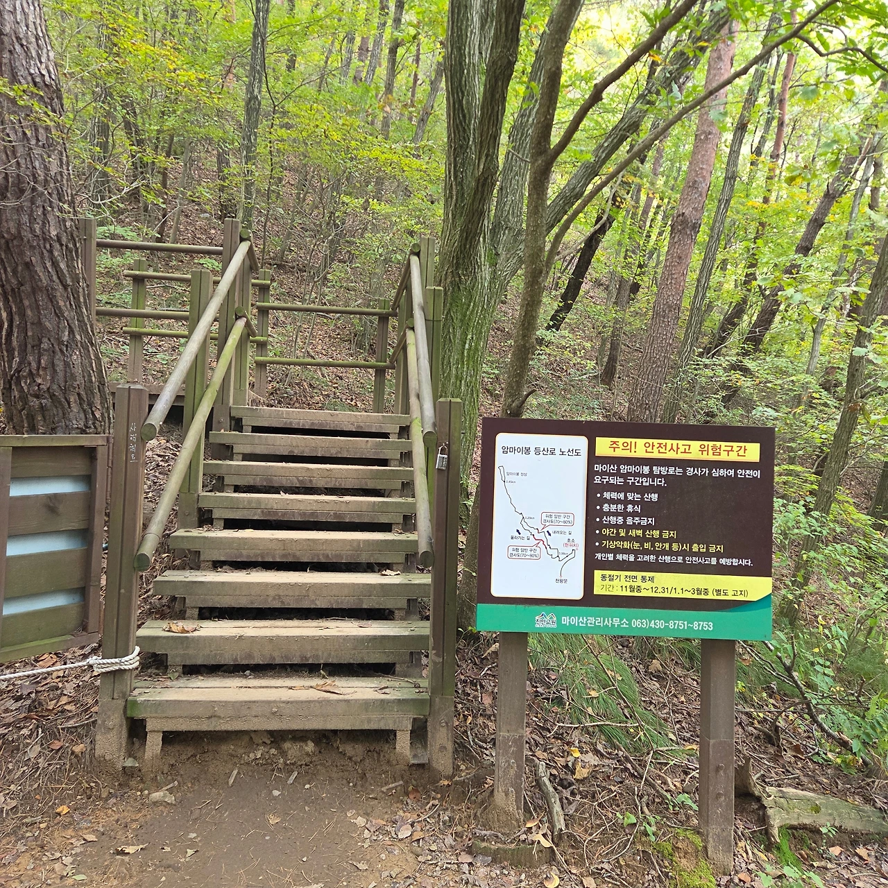고갯마루에 도착했는데, 공사 중이다. 숫마이봉 중턱에 있는 화엄굴과 천왕문을 가는 길은 폐쇄되어 있었다. 휴식터도 공사 중이었다. 이곳은 분주령인데, 한쪽은 섬진강, 한쪽은 금강의 물이 된다고 하던 곳이다. 그 표시도 없었다. 휴식터가 없어져 암마이봉을 오르기 전의 휴식터에서 잠시 숨을 고르고 올랐다.오르는 길과 내려오는 길이 다르기에 그래도 큰 부담은 없지만, 수직으로 150m 이상을 오르기에 쉽지는 않다. 그리고 겨울에는 안전상 통제가 된다.