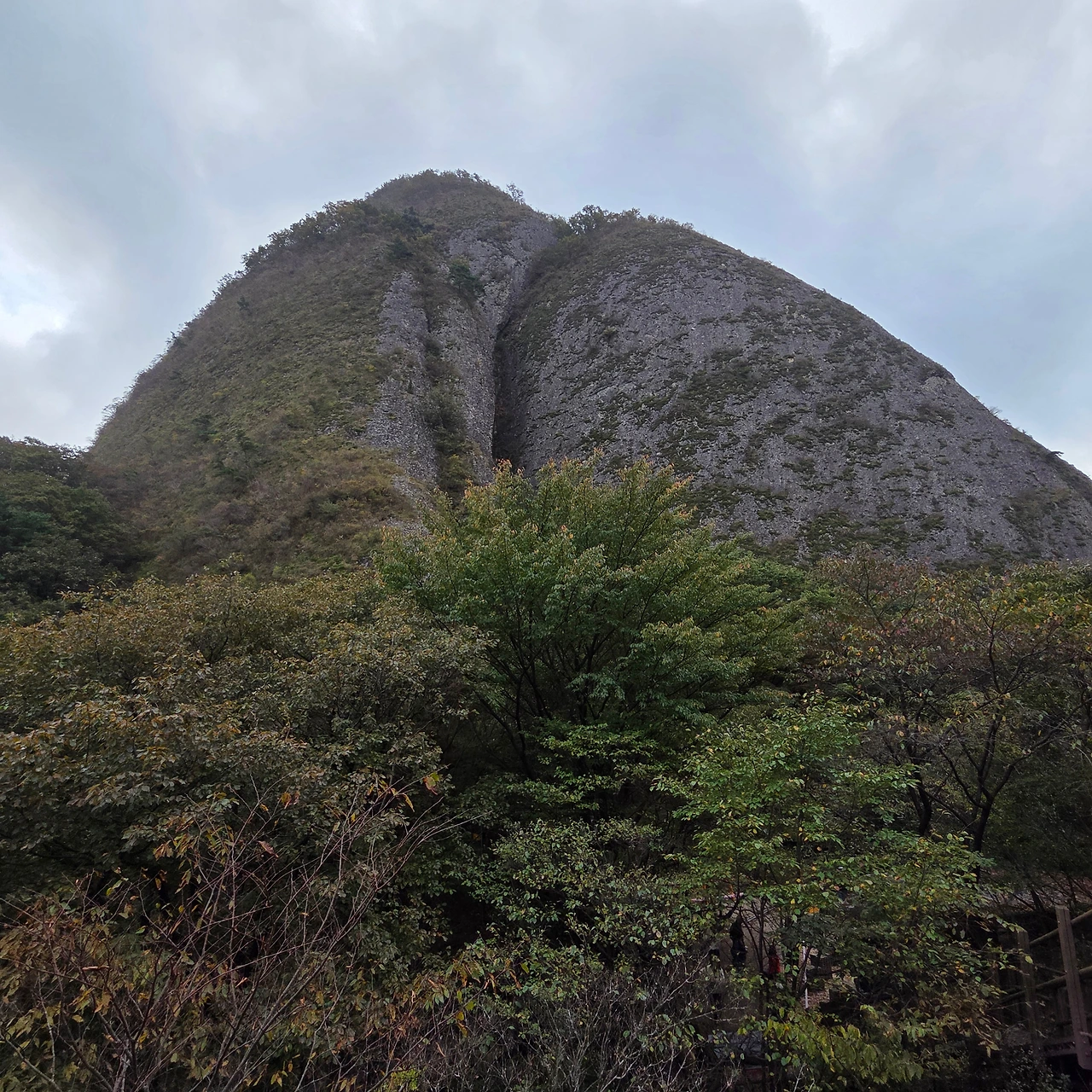 오르면서 시야가 트이고 약간의 여유를 가질 수 있는 공간에서 숫마이봉을 사진으로 담았다. 이것이 힘들게 산행하면서 여유를 찾는 것이라고 할 수 있을 것이다. 암마이봉 정상을 150m 정도 남겨 두었을 때 전망대가 있다. 숫마이봉 전체를 조망할 수 있다. 그리고 그곳에서 화엄굴을 멀리서 조망할 수 있다.