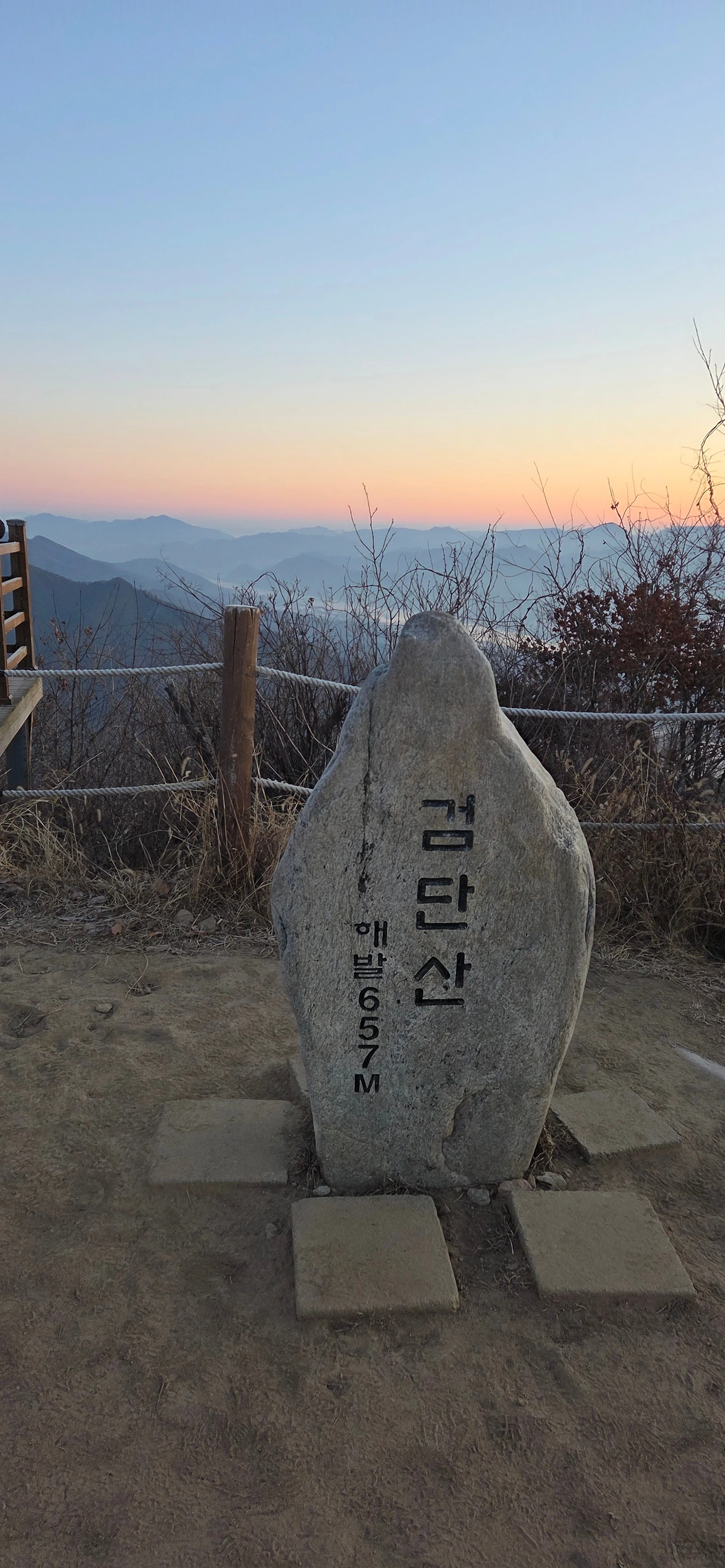 능선 직전의 가파른 구간에 다다르자 J가 "오색 코스로 설악산 오르는 것보다 쉽네!"라며 잘도 걷는다. 그 기세에 힘입어 마침내 7시 42분, 검단산 정상에 도착했다. 아직 일출 전이었다. 정상석에서 인증 사진을 찍고 싶었지만, 이미 많은 이들이 동쪽을 향해 자리를 잡고 있어 우리도 조용히 그 대열에 합류했다. 기다림 끝에 마주할 일출에 미리 감사한 마음을 가졌다.