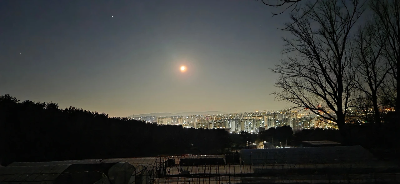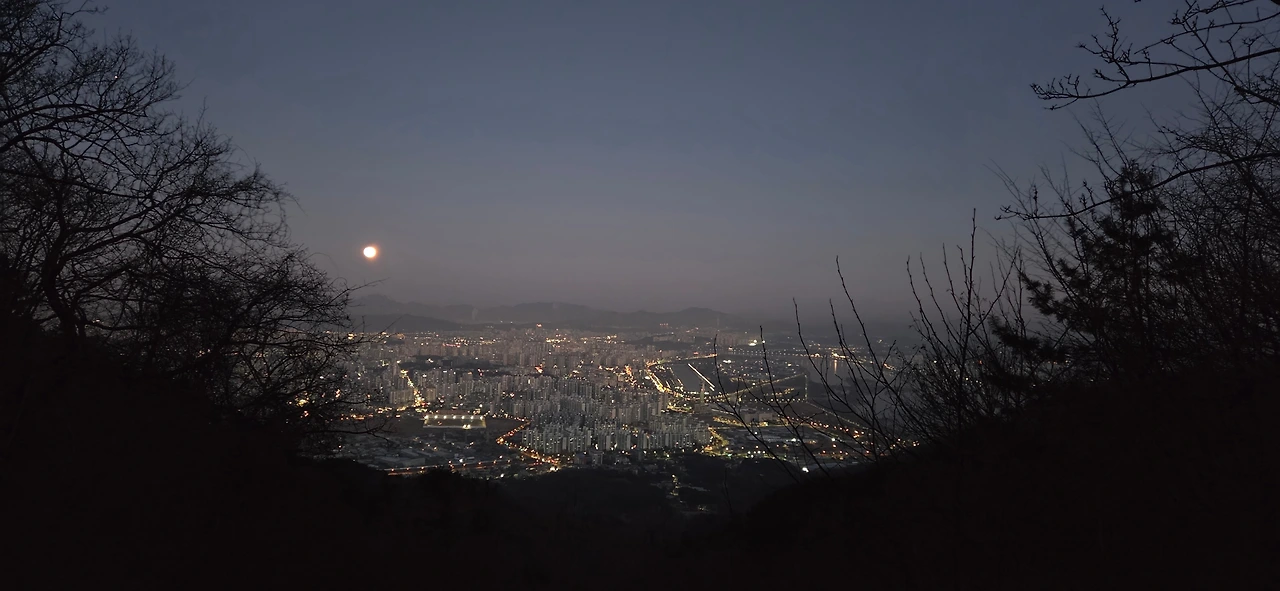 현충탑 근처에서 3명이 모였다. 한 명은 끝내 '곰'이 되어 나타나지 않았지만, 남은 우리 셋은 헤드랜턴을 켜고 야간 산행을 시작했다. 걸음이 빠른 이들에게 길을 양보하며 천천히 발을 뗐다. 내 랜턴은 빛이 약했지만 달빛과 친구 H의 랜턴 불빛 덕분에 길을 잃지 않았다. 하남 쪽 코스는 가파르긴 해도 북사면(North Face)이 아니라서 다행히 바람이 거의 없었다. 도시의 불빛이 서서히 멀어지고, 여명이 밝아오는 하늘에는 달빛이 자리를 지키고 있었다.