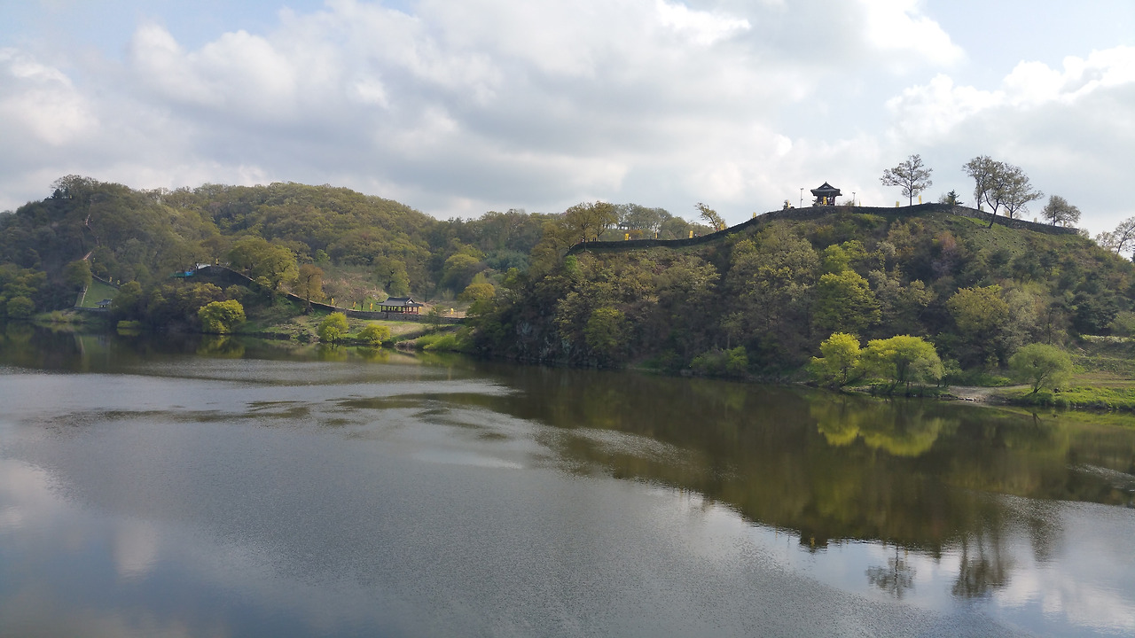 금강철교를 지나면서 공산성을 보니 그림 같은 풍경이다. 이를 담아 본다. 하늘의 구름이 금강에 비치어 그림을 그렸고 공산성의 산그늘이 또한 밑그림을 그리고 있다.