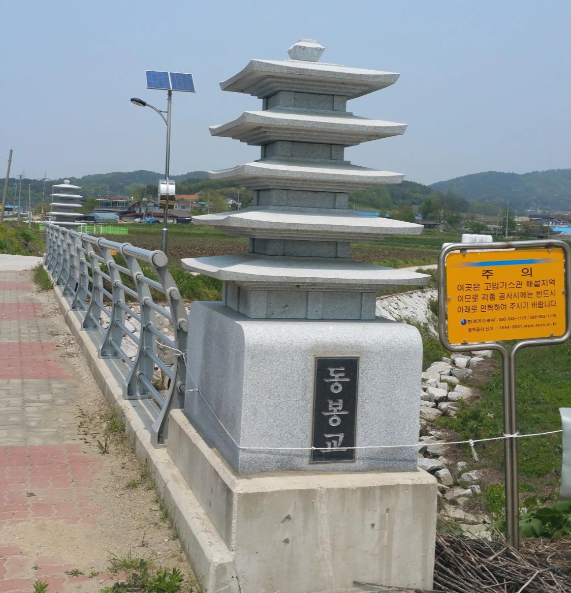 익산은 미륵사지가 있다. 백제 최대의 사찰이었던 익산 미륵사는 무왕(武王, 600-641) 대에 창건된 것으로 알려져 있다. 미륵사는 전형적인 1탑1금당의 백제식 가람배치와 달리 세 개의 탑과 금당 등으로 구성된 3탑3금당의 독특한 배치형식이다. 이 미륵사지 석탑은 세 개의 탑 중 서쪽에 위치한 탑이다. 익산에서 원수제, 왕궁저수지를 가는 하천에 있는 다리 위에 이러한 석탑을 표시하여 사진에 담아 보았다.