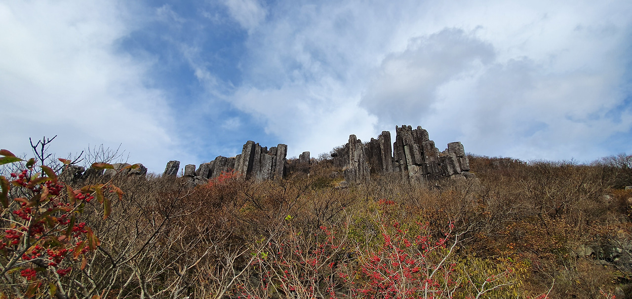 입석대 전망대를 앞에 두고 옆에 주상절리가 무너진 바위군이 보여 잠시 여유를 가지려 빠져서 전망하니 입석 대전체가 보인다. 앞뒤 조망이 전망대보다 좋다.