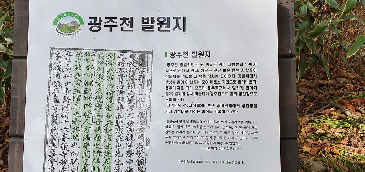 중머리재에서 장불재로 방향을 잡고 올라가는 길에 광주천의 발원지가 있다고 설명이 되어 있고 조그마한 샘에서 물이 솟아나 너도나도 목을 추이고 조금 더 오르니 또 옹달샘이 있다. 여기가 조금 더 위니 여기가 발원지인데 하면서 표지판의 위력을 실감한다.
