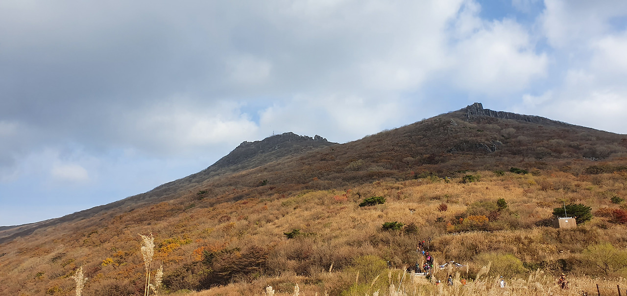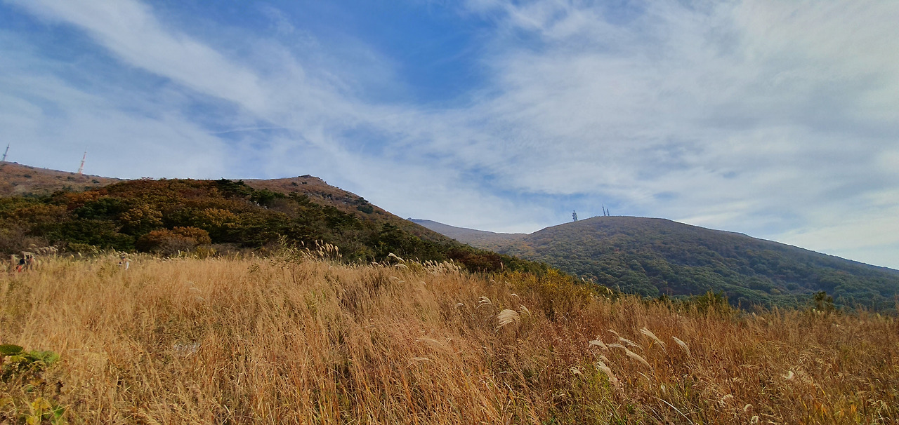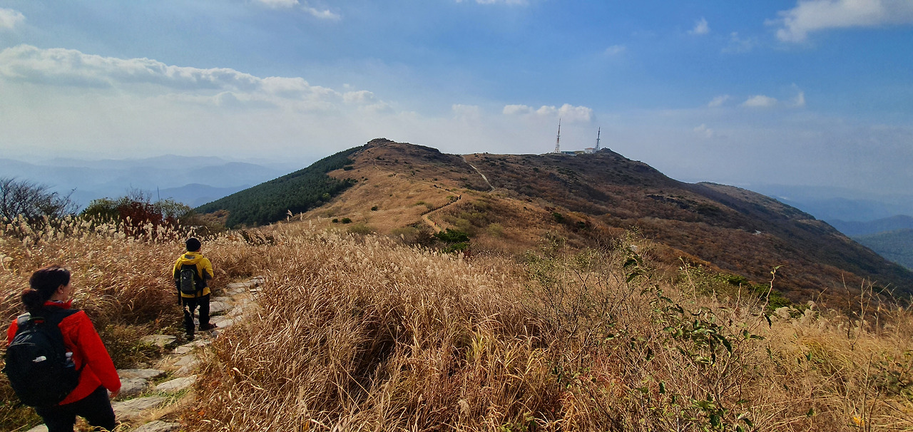 중머리재에서 장불재를 바라보니 억새 뒤로 장불재가 보이며 장불재에 있는 송신탑 등이 거슬린다.