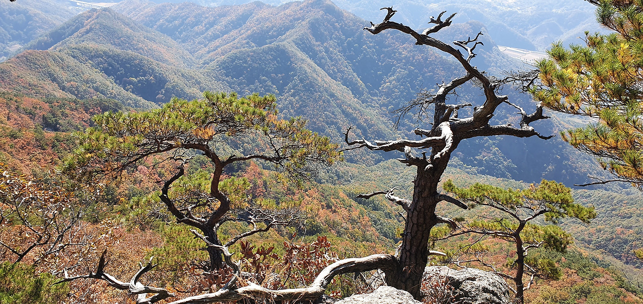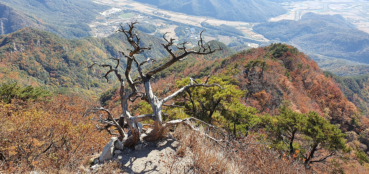 신선대를 지난 후 824봉이다. 바위 벼랑길을 이용하여 올라갈 수 있어 824봉에 올라가서 주변 조망도 보고 휴식도 취한다. 묘봉 능선은 국립공원 측에서 등산로를 관리를 잘하여 어느 정도 어려움이 해결되고 데크가 있으나 구병산은 보은군에서 관리하고 있어 어려운 구간은 우회하고 폐쇄 안내를 한다. 824봉의 고사목과 소나무의 어울림이 기가 막혀 그림 속에 담아본다.