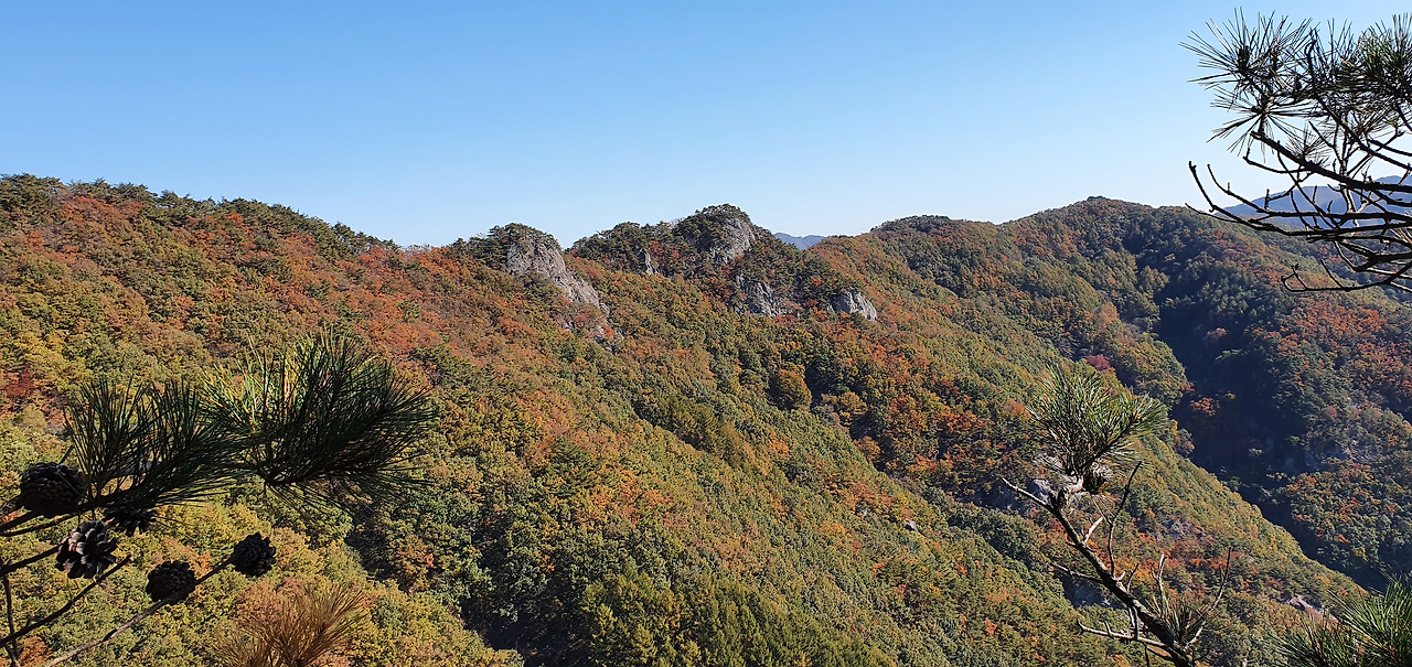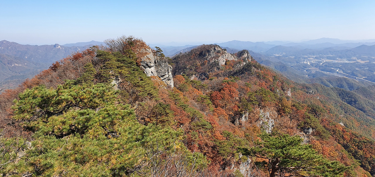 틈새 바위를 지나자 능선이다. 주위에 대한 조망이 된다. 충북알프스의 능선이 보인다. 저능선을 타고 가면 형제봉을 거쳐 천황봉 문장대로 가는 것이다.