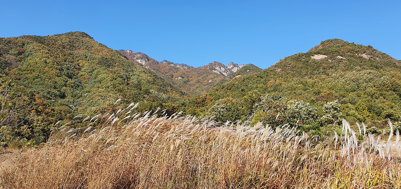 우여곡절을 겪으면서 하산하니 단풍이 제철을 맞았고 갈대와 구병산 능선이 조화를 이루고 있다.