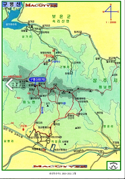 처음으로 구병산을 간다. 서울에서 구병산을 쉽게 가기 위하여 승용차를 이용할 때에는 속리산 ic를 나와 국도를 이용하여 이동하다가 구병산 이정표를 보고 구병산 쪽으로 들어간다. 마을 입구에 등산객 산행차량 진입금지라고 표지가 있는데 주차장도 잘되어 있는데 왜 그런지 모르겠다.