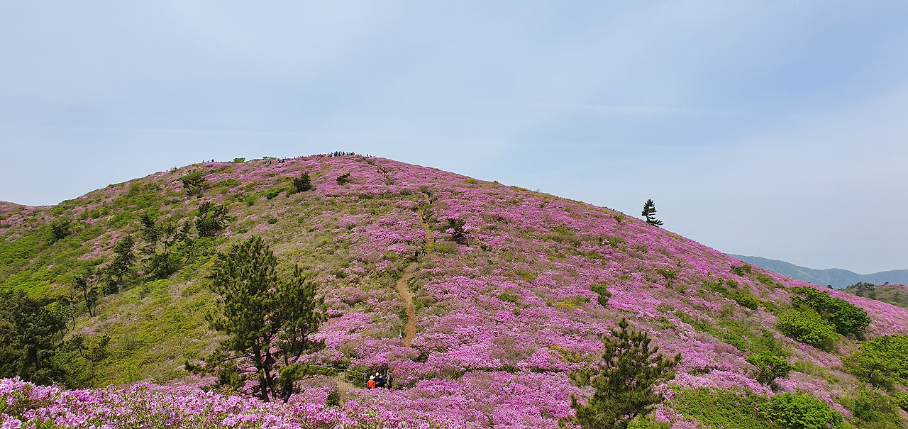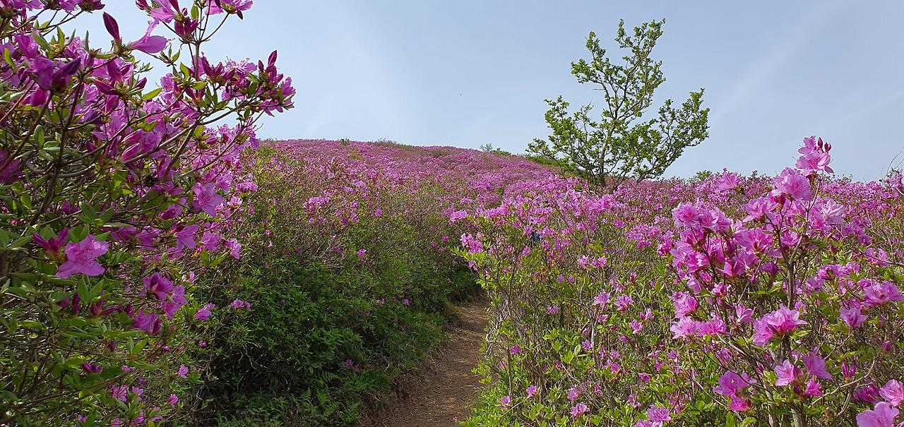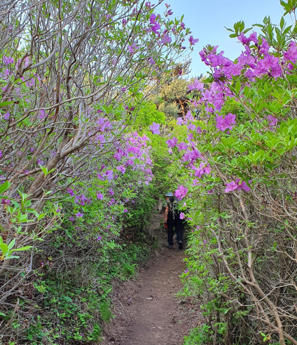 강화도의 고려산이 진달래가 만발할 때 붉게 물드는데 그 이상이다. 수도권이었으면 사람 반 꽃 반이었을 것이다. 남쪽끌에 자리 잡아 그렇지 한번 볼 가치가 있는 산이다. 이제 우리가 올라서는 마지막 산이다. 일임산이다. 산을 올라서는데 드론이 머리 위에 있다. 드론으로 보면 좀 더 멋이 있을 것이다. 철쭉 동굴이다.