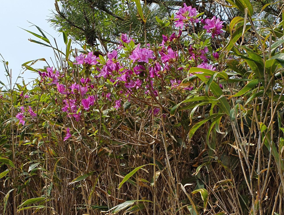 우리는 용추계곡으로 방향을 튼다. 산죽이 양쪽에 길을 맞고 있다. 산죽 사이에 철쭉이 있어 산죽 꽃이 핀 것 같다.