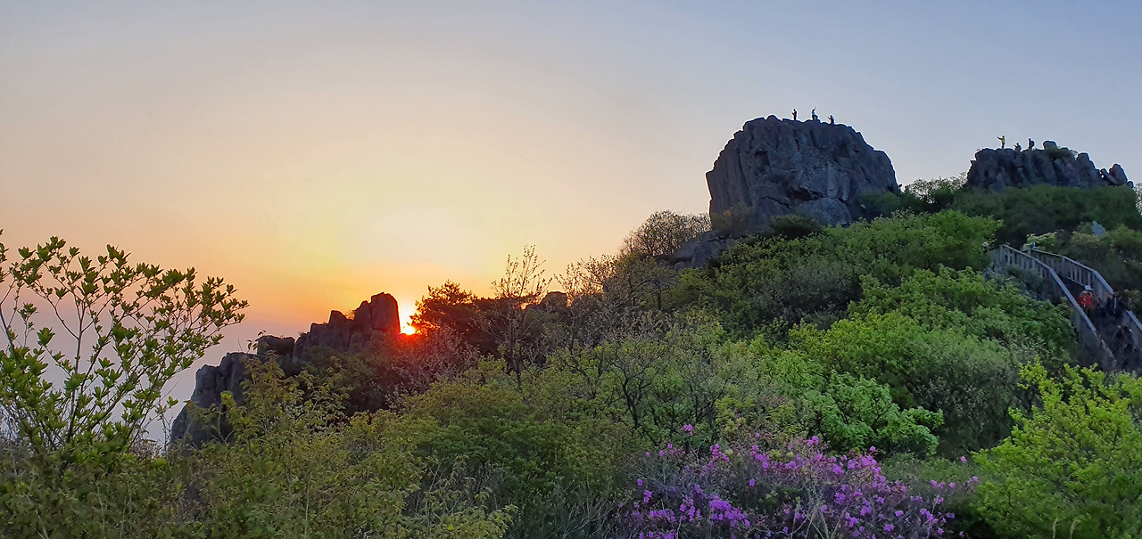 바위와 나무 사이에 솟아오르는 태양의 묘미를 보았다. 이것이 일출을 보는 기쁨도 된다.