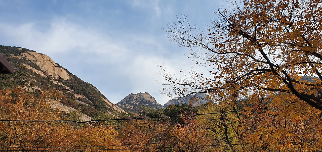 북한동 전시관이 있는 곳에서 계곡길이 아닌 포장길을 이용하여 산성입구 탐방지원센터로 내려온다. 지난여름 아내와 함께 대동문까지 갔다가 올 때 국립공원공단 직원들이 길옆에 나무에 매미나방 애벌레가 급습하여 이를 제거하는 모습을 보았는데 오늘은 그 나무들이 홍엽이 되어 사람들을 불러 모으고 있다. 자연은 인간이 무엇이라고 하여도 그대로 자연인 것이라고 보아야 할 것이다.