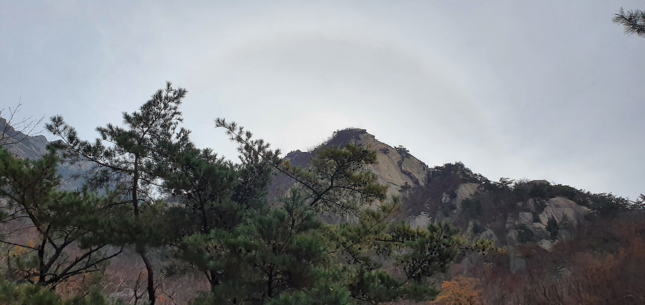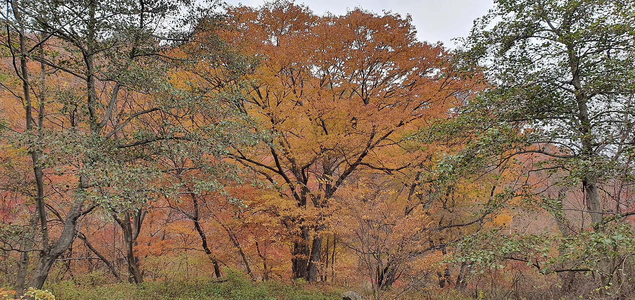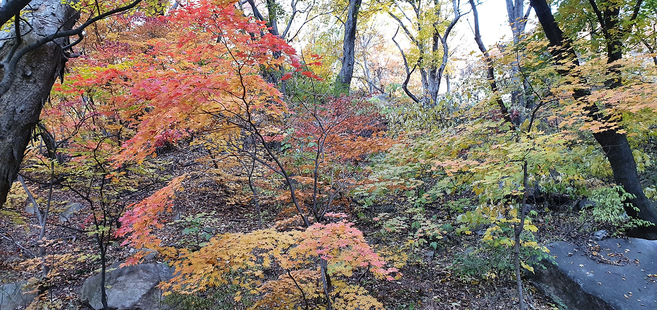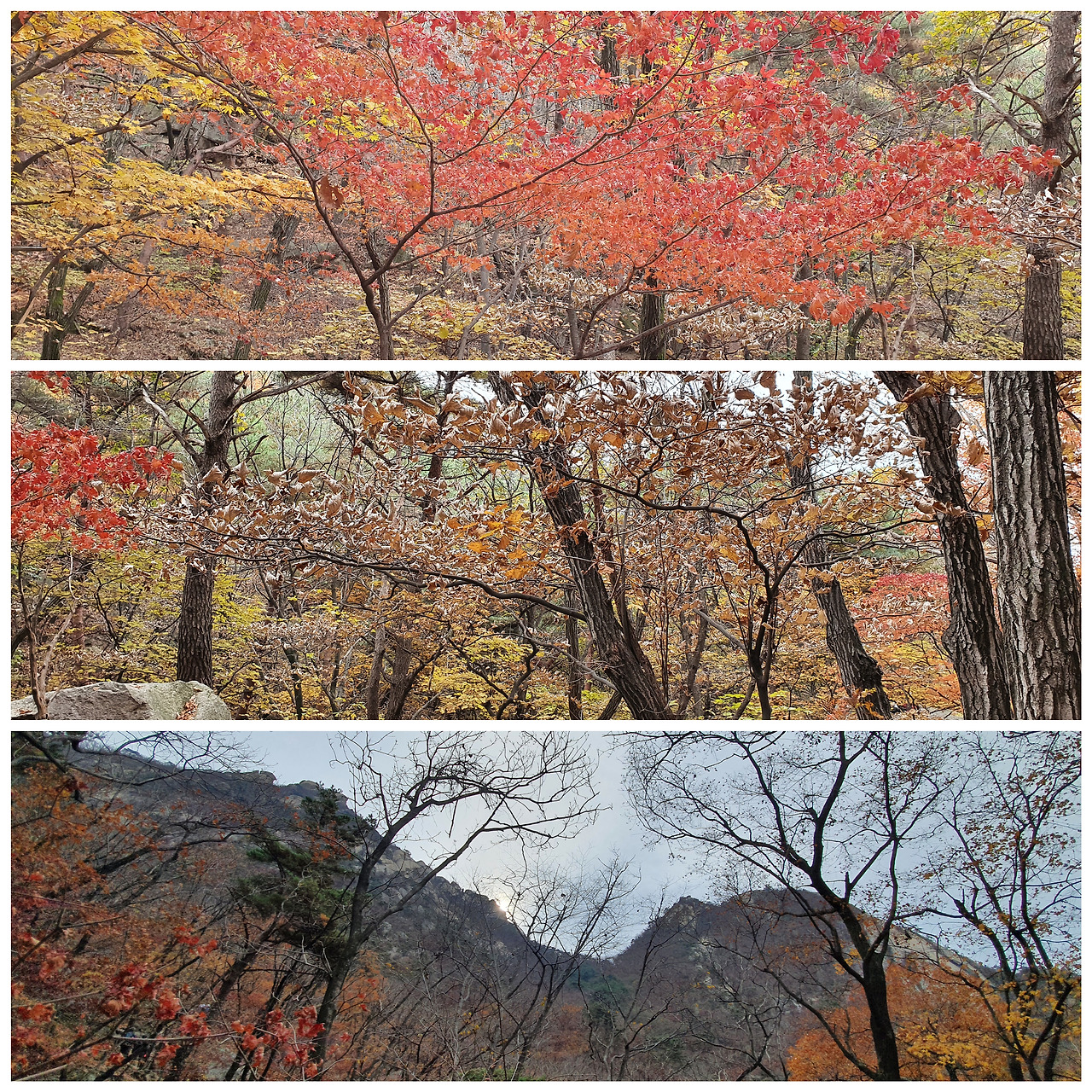 10월 말이다. 3월 말에 산을 오르는 것과 비슷한 형태가 나타나지만 3월 말에는 앙상한 가지와 녹음이었으나 이제는 높은 지역은 낙엽이 다 떨어지고 있고 낮은 지역은 단풍이 제철이다. 북한산에도 이러한 모습을 볼 수 있다.