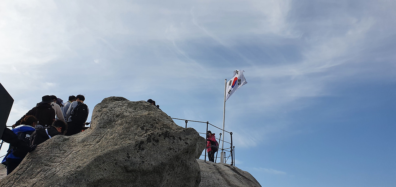 백운대에 올라 백운대 정상석과 태극기를 배경으로 인증샷을 남기기 위하여 많은 사람이 줄을 섰고 우리는 그것에 동참하지 않고 살짝 비켜난 곳에서 태극기를 배경으로 인증샷을 남긴다.