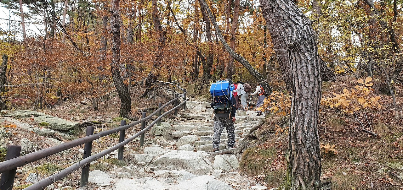 대동문 쪽으로 대부분 사람들이 가는 것을 보고 우리 등산로 방향을 물으니 나는 왼쪽이다 이야기한다. 대부분의 사람들이 가는 방향은 하산로라고 이야기하고 오르는데 어느 사찰의 스님인지 보살님인지 지게꾼을 뒤로하고 가고 있다. 저 지게꾼이 있기에 사찰에 물자가 공급되고 대피소나 산장이 운영되는 것이다. 무척이나 힘들게 올라가지만 저분은 생업 우리는 취미생활이 되는 것이다.