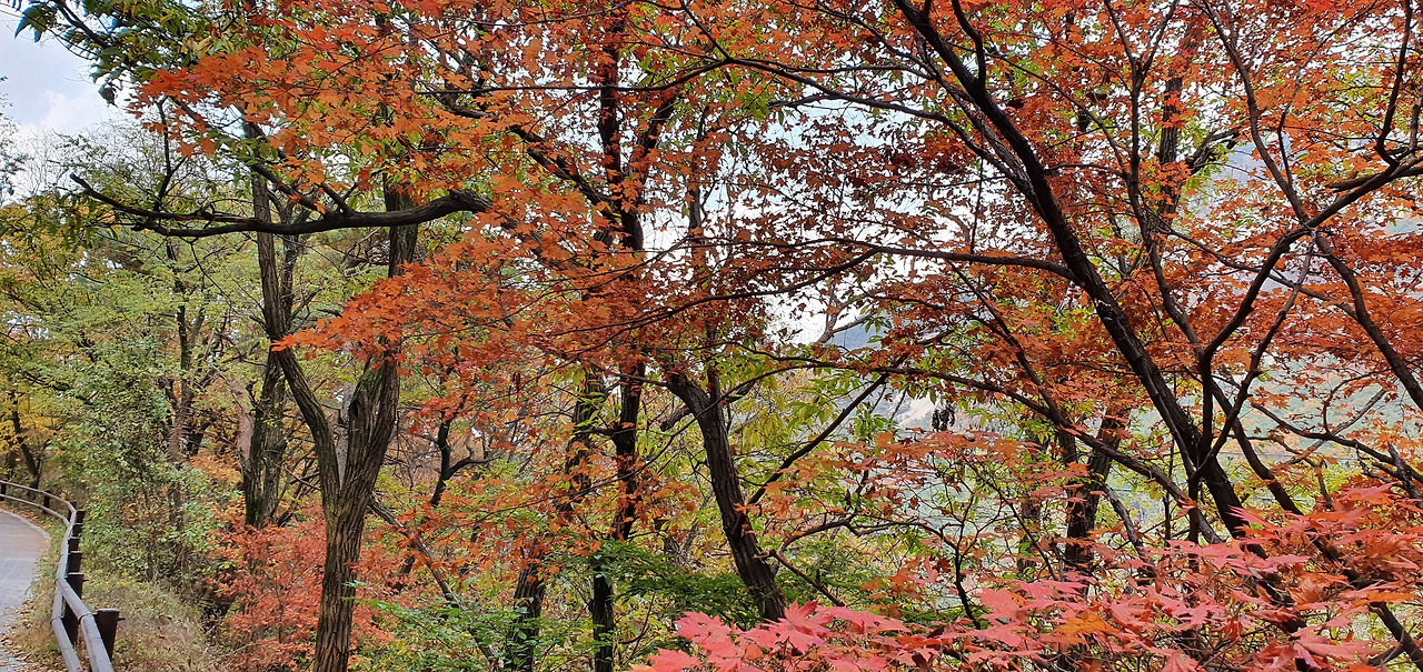 대동사 인근을 지나기 위하여 개울을 지나는데 산이 온통 물들어 있다 불타는 산이라고 할 수 있다. 어제 족두리봉을 중심으로 산불이 난 만큼 산을 보호하기 위하여 너도 나도 조심하여야 할 것이다. 산이 자연스럽게 불타야 하는데 인위적으로 불타오르면 우리 모두의 불행일 것이다.