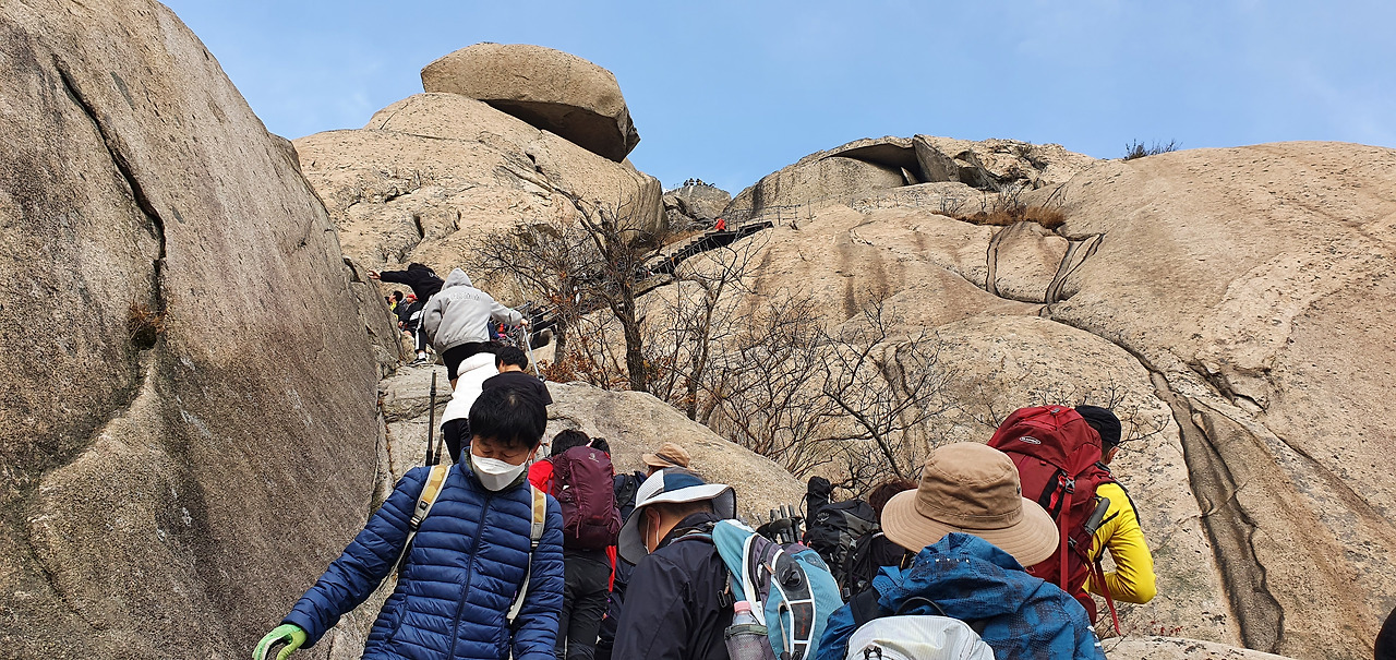 백운대에서 하산을 하는 데 앞에 어린 친구가 하산을 하면서 어려움이 있고 엄마, 아빠가 안절부절못하다가 잠시 기다리는 여유를 갖기로 한다. 뒤에 모든 사람들이 그 친구 때문에 정체되기 때문이다. 내려올 때 우리는 일방통행 지점에 재 빠르게 도착하였다. 그리고 그 행렬에 붙어서 잘 붙어서 내려왔다. 올라오는 사람들인 많았지만 한 번은 내려가고 한 번은 올라오는 것이 일반통행 지점이다.