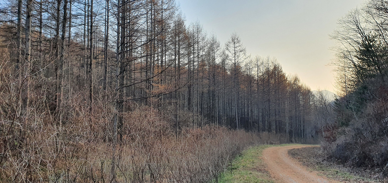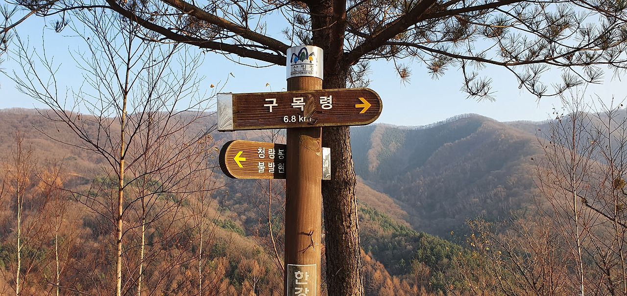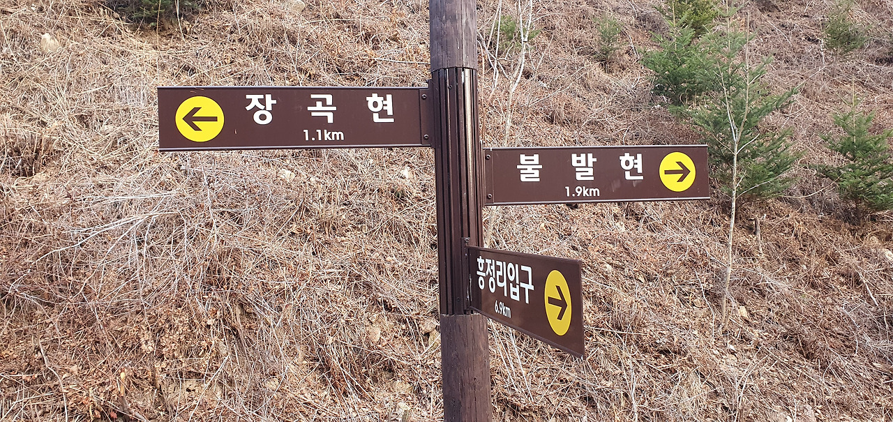 이제 임도의 끝이며 장곡현에 도작하였다. 구목령으로 가는 길이 보인다. 오늘은 여기까지다. 여기서 더 가면 갈 수 있겠지만 이제는 늦가을이라 17시 30분이면 어둠이 찾아온다. 산속에서 어둠을 맞으면 어려움이 있고 탈출에도 어려움이 있다고 본다. 임도를 따라 6km를 내려가면 흥정마을이 있다. 이 흥정계곡이 어떻다는 사실도 모르고 무작정 걸어본다.
