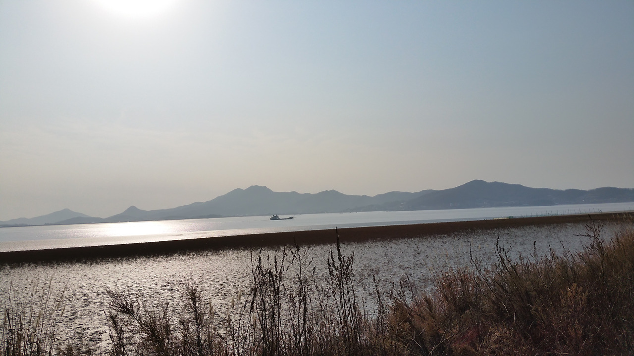 간척을 해서 그런지 아직은 농토로 변하지 않은 염생식물군락지도 있고 이제 염분이 빠져 논이 된 곳도 있었다. 교동도에서 본 그 넓은 논이라 그런지 특별한 감흥은 없다. 저수지도 있다. 그래서 멀리 보이는 산을 카메라로 당겨서 촬영하니 보문사 뒤편의 바위와 마애석불이 보이는 것 같다.