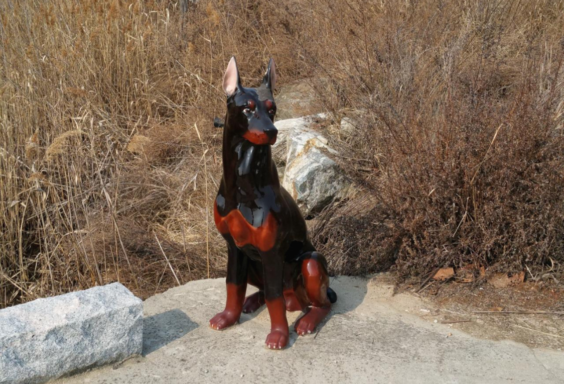 낚시터를 지나서 걸으면 또 제방이다. 제방을 지나는 멋있는 조형물이 있다. 개 한 마리가 지키고 있다. 조형물이지만 실물에 가깝게 만들어 놓아서 담아보았다. 이런 조형물도 기념물이 되지 않을까 생각한다.