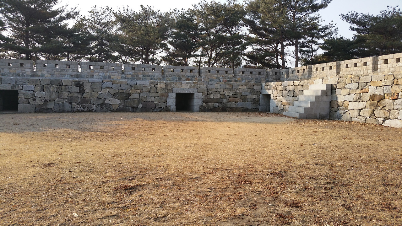 계룡돈대에 도착하였다. 북쪽면만 남아 있었으나 이제는 원형 그대로 복원하였다고 한다. 계룡돈대는 1679년(숙종 5)에 쌓은 48 돈대 가운데 하나로 ‘광대돈대’로도 불린다. 둘레가 108m인 방형구조로 석벽 높이는 290㎝~670㎝이다. 동쪽 출입문 옆으로 명문(銘文)이 있다. ‘강희 18년 4월 일 경상도 군위어영(康熙十八年四月日 慶尙道 軍威御營)’이다. 강희 18년(1679) 4월 어느 날 경상도 군위현에서 온 어영청 소속의 군대라는 의미이다. 돈대 쌓은 시기를 알 수 있는 귀중한 명문이다. 계룡돈대는 진보에 소속되지 않고 진무영에서 파견된 천총(千摠) 세 사람이 돌아가며 담당하는 영문 소속 돈대였다.
