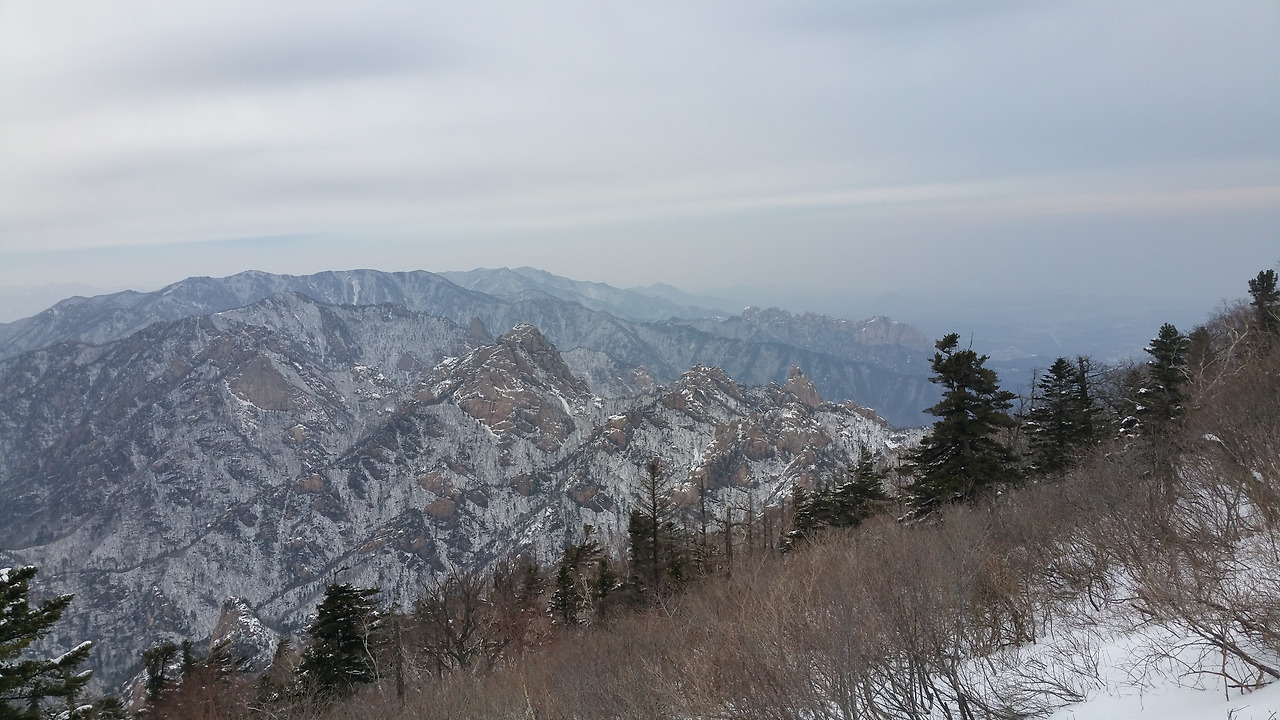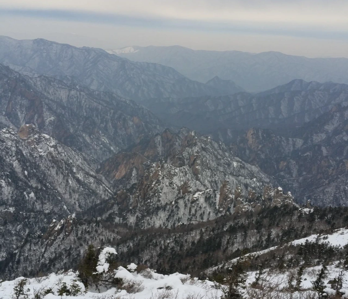 대청봉에서 공룡능선도 보고 중청도 본다. 공룡능선은 위험하다고 하여 공단 측에서 통제를 한다고 한다. 눈이 많이 온 이유다. 산을 찾는 사람들은 특히, 안전에 유의해야 한다. 여름 산은 탐방로를 벗어나도 그렇게 문제가 되지 않지만 겨울산은 눈 속에 어떠한 위험이 도사리고 있는지 모르기 때문에 탐방로를 벗어나면 안 되고 위험할 경우 등산로 통제하면 들어가면 안 된다고 본다. 저 능선을 갈 수가 없다. 겨울에 보는 공룡능선을 눈이 있어서 그런지 뚜렷하게 능선이 보이지도 않는다.