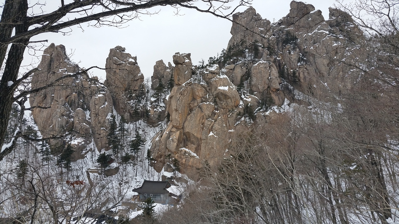 중청봉 8부 능선을 따라 소청봉에 올라 아래를 내려본다. 이제 용아장성을 보는데 능선이 뚜렷하지 않다. 겨울이라 그런 것 같다. 조금 내려가면 소청대피소가 있고 그다음이 봉정암이다.