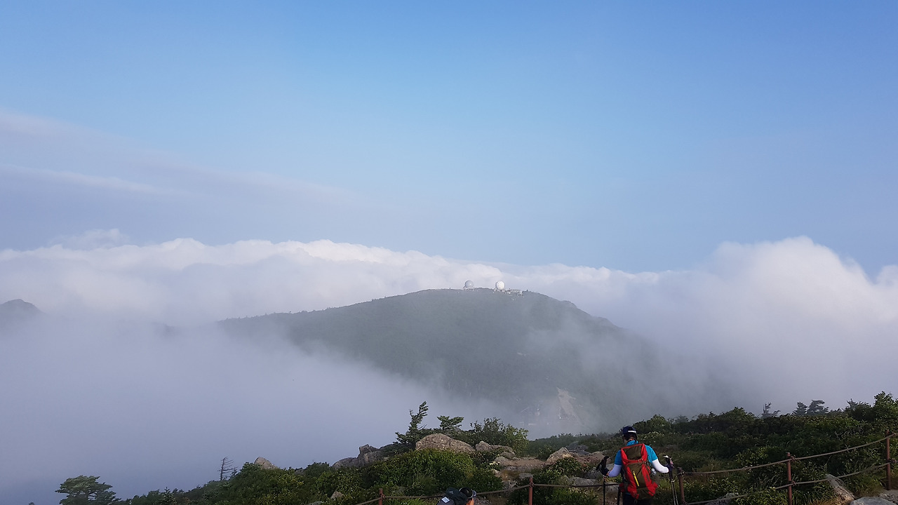중청을 바라보니 구름이 넘어오고 순간적으로 중청대피소가 구름 속에 갇혀 버리며 몽환적인 분위기를 만들어 버린다. 우리가 대청을 올라오면서 여름이라 1시간 이상이 추가 소요되었다. 우리가 올라온 시간이 공룡능선을 넘을 시간이 될 수 있을지 모르지만 그래도 우리는 도전하기로 결론을 내렸다. 저 구름이 우리를 더위에서 도와줄 것이라는 희망을 품었다. 그것이 희망이 아니라 구름이 우리를 더위에서 구해주었다.