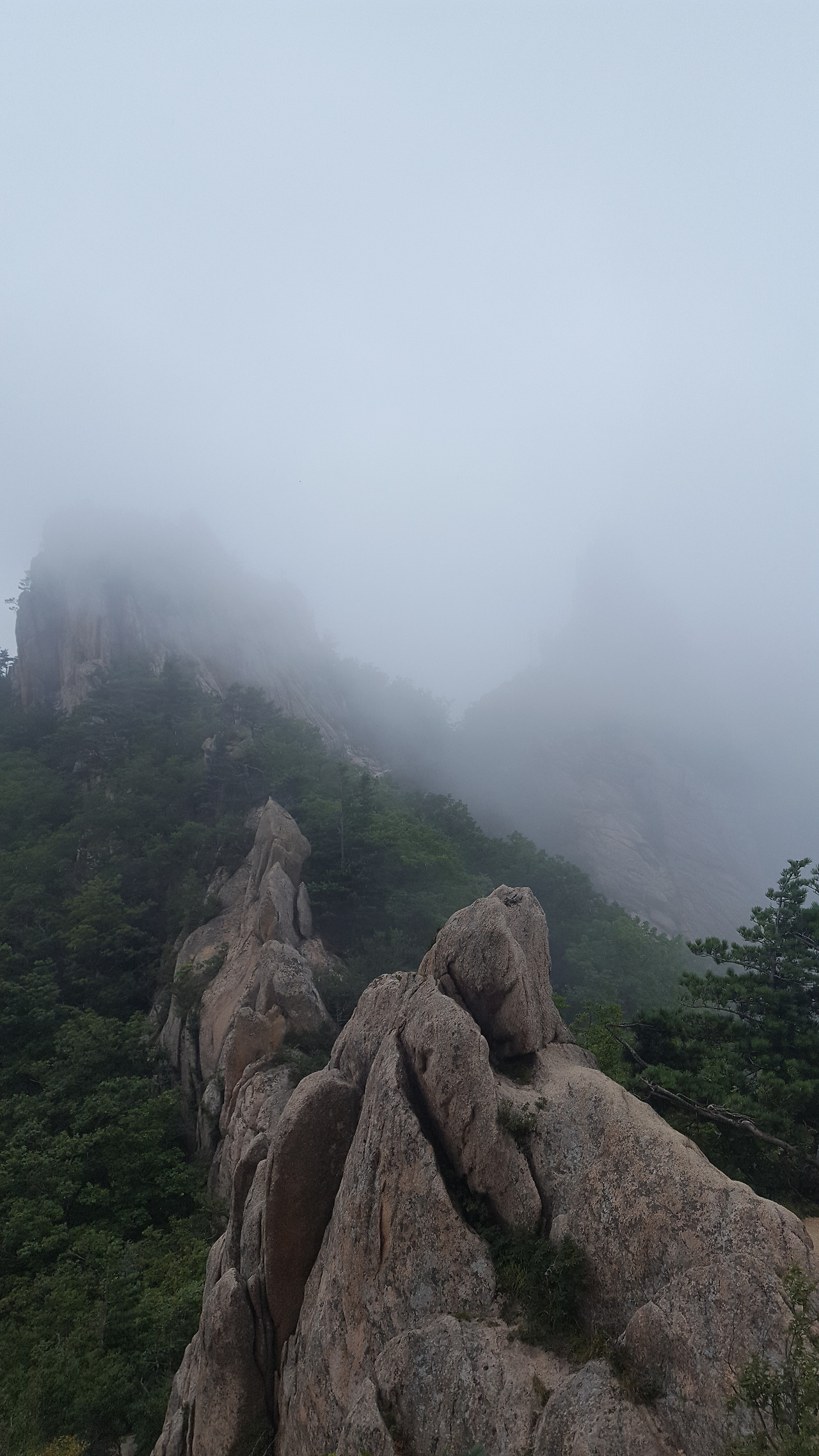 신선대 정상은 사람이 들어갈 수 있는 조그마한 돌 웅덩이가 있다. 누군가가 여기 들어가서 기념사진도 찍어 본다. 공룡은 50m의 가시거리 밖에 없다. 사실 안개비가 내리고 있어서 우리는 구름이 걷히기를 바라지만 구름은 살짝 공룡능선을 보여줄 뿐이다. 여름에 공룡을 걷는 사람은 그렇게 많지 않다. 우리가 늦어서 그런지 우리를 추월하는 사람이 없는 것이다