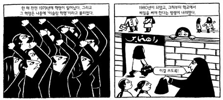 이 작품 속에서 사트라피는 급진 이슬람 정권이 들어서는 바람에 강제로 차도르를 입습니다. 파티도, 술도, 여자 혼자 돌아다니는 것도 금지됩니다.