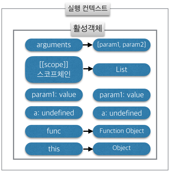 위 그림이 실행 컨텍스트와 활성 객체의 구조도입니다. 바로 이 컨텍스트 영역이 execute 함수가 참조할 수 있는 값들에 대한 유효 범위, 즉 바로 스코프가 됩니다.