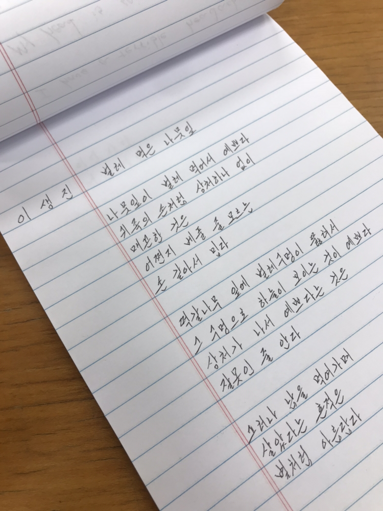 벌레 먹은 나뭇잎 이생진나뭇잎이 벌레 먹어서 예쁘다.귀족의 손처럼 상처 하나 없이매끈한 것은어쩐지 베풀 줄 모르는손 같아서 밉다.떡갈나무 잎에 벌레구멍이 뚫려서 그 구멍으로 하늘이 보이는 것이 예쁘다.상처가 나서 예쁘다는 것은 잘못인 줄 안다. 그러나 남을 먹여가며 살았다는 흔적은 별처럼 아름답다.