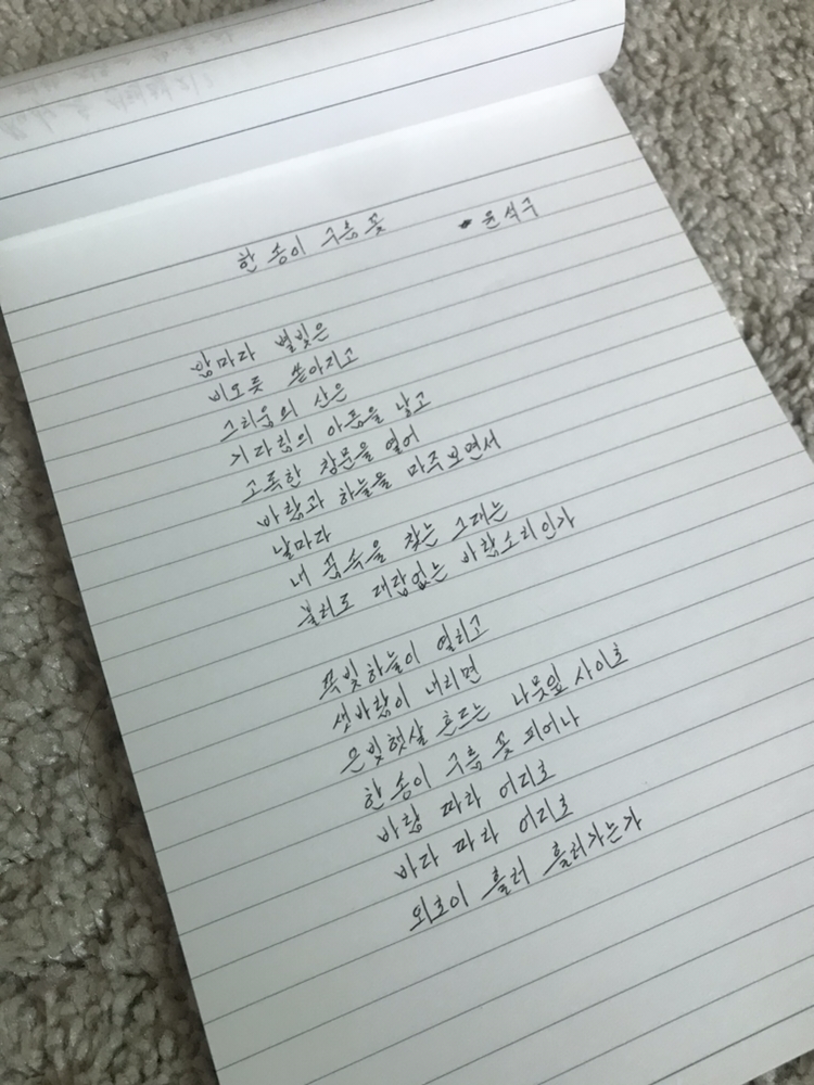 한 송이 구름 꽃 윤석구밤마다 별빛은 비오듯 쏟아지고 그리움의 산은 기다림의 아픔을 낳고 고독한 창문을 열어 바람과 하늘을 마주보면서 날마다 내 꿈속을 찾아드는 그대는 불러도 대답 없는 바람소리인가 쪽빛하늘이 열리고 샛바람이 내리면 은빛햇살 흔드는 나뭇잎사이로 한 송이 구름 꽃 피어나 바람 따라 어디로 바다 따라 어디로 외로이 흘러 흘러가는가