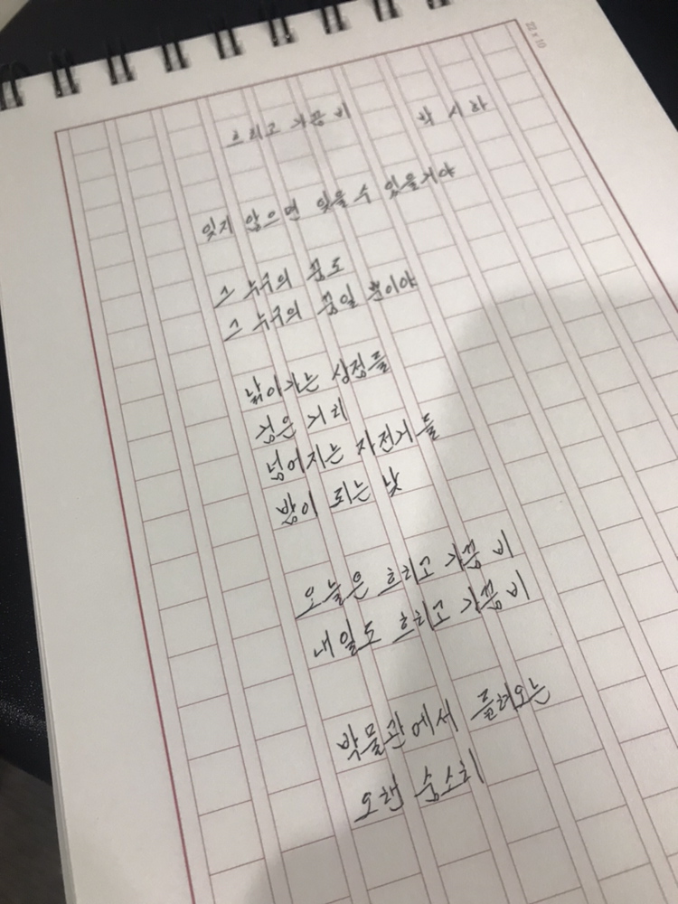 흐리고 가끔 비 박시하잊지 않으면 잊을 수 있을 거야그 누구의 꿈도그 누구의 꿈일 뿐이야낡아가는 상점들검은 거리넘어지는 자전거들밤이 되는 낮오늘은 흐리고 가끔 비내일도 흐리고 가끔 비박물관에서 들려오는오랜 숨소리