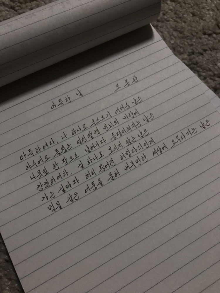 아득한 날 도종환 아득하여라. 나 하나도 추스리기 어려운 날은하루에도 들끓는 일천팔백 번뇌의 바람에나뭇잎 한 장으로 날려가다 동댕이쳐지는 날은캄캄하여라. 길 하나도 보이지 않는 날은가는 길마다 허리 끊어진 허방다리인데먹물 같은 어둠을 묻혀 벼루만한 세상에 고꾸라지는 날은