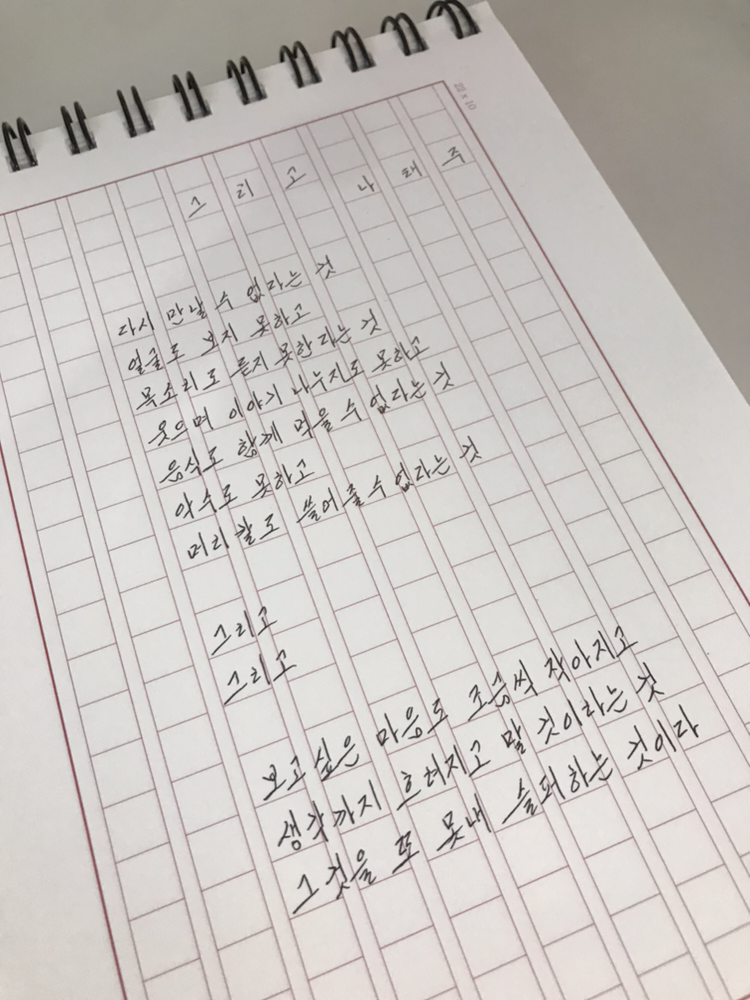 그리고 나태주다시는 만날 수 없다는 것얼굴도 보지 못하고목소리도 듣지 못한다는 것 웃으며 이야기 나누지도 못하고음식도 함께 먹을 수 없다는 것악수도 하지 못하고머리칼도 쓸어줄 수 없다는 것그리고그리고보고싶은 마음도 조금씩 작아지고생각까지도 흐려지고 말 것이라는 것그것을 또 못내 슬퍼하는 것이다