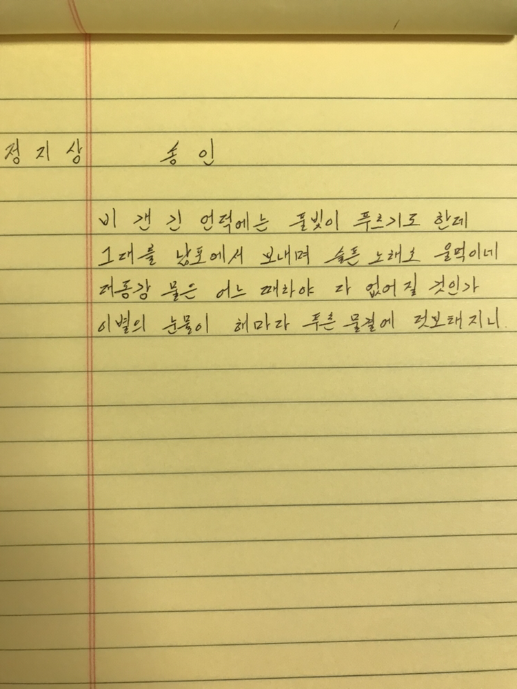 송인 - 정지상 雨歇長堤草色多送君南浦動悲歌大同江水何時盡別淚年年添錄波비 갠 긴 언덕에는 풀빛이 푸르기도 한데그대를 남포에서 보내며 슬픈 노래로 울먹이네.대동강 물은 어느 때라야 다 없어질 것인가 이별의 눈물이 해마다 푸른 물결에 덧보태지니.