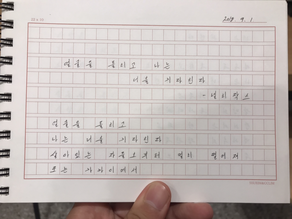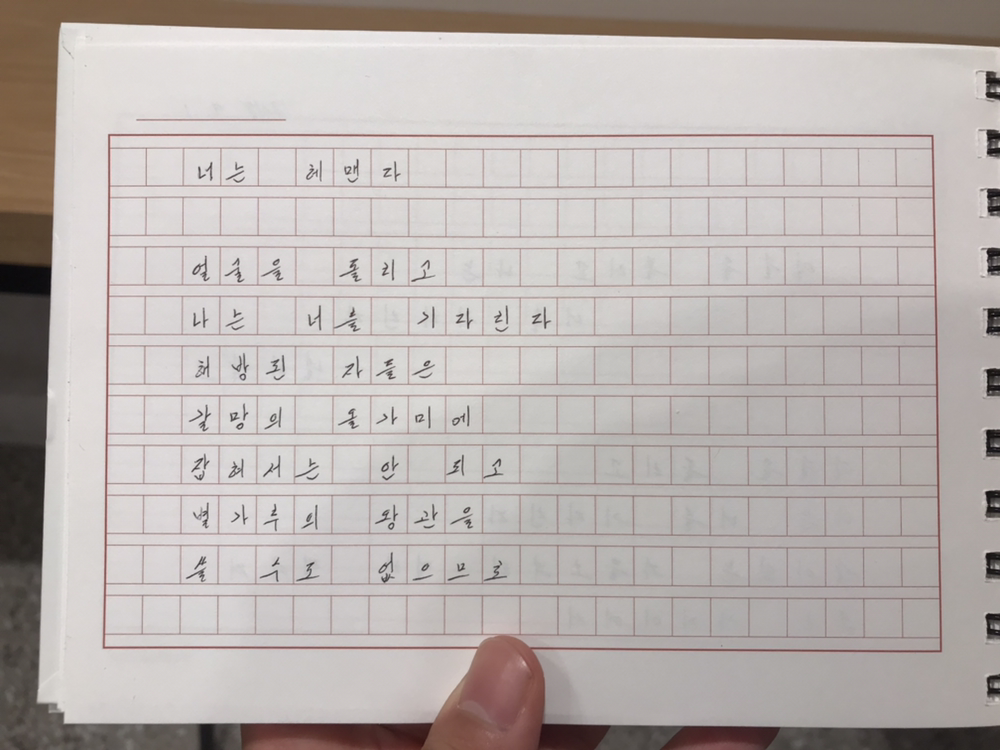 얼굴을 돌리고나는 너를 기다린다살아있는 자들로부터 멀리 떨어져또는 가까이에서너는 헤맨다얼굴을 돌리고나는 너를 기다린다해방된 자들은갈망의 올가미에잡혀서는 안 되고별가루의 왕관을 쓸 수도 없으므로사랑은불에 태워도소멸되지 않는 모래의 풀얼굴을 돌리고사랑은 너를 기다린다