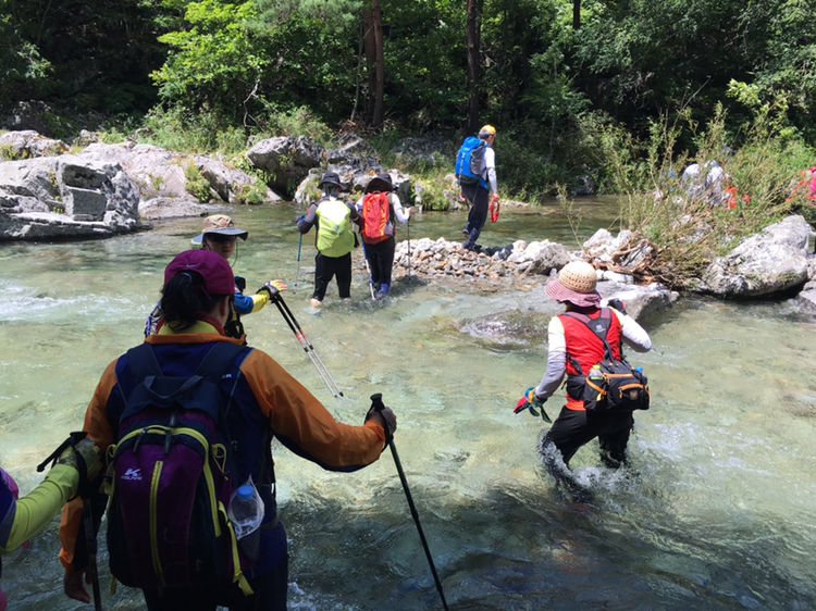 계곡 트레킹은 곳곳에 여러 위험요소가 도사리고 있다. 특히 장마철 직후엔 물이 불어나 곳곳의 깊은 웅덩이와 빠른 물살이 사람을 허우적거리게 한다. 그러기에 나홀로 걷기보다 무리지어 내려가는 모습이 더욱 평안함을 준다. 물에 젖은채 붙잡아주는 손길이 따뜻함을 전해오고 물살을 견뎌내는 발바닥 밑의 바윗돌 촉감이 부드럽기만 하다.