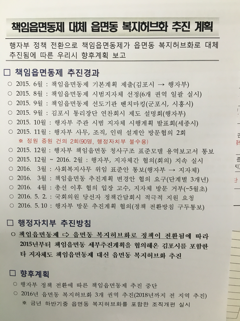 책임읍면동제를 적극권장할때는 언제고..예산 세우고 진행하려니 이제 그만하란다..행자부 공무원 나리들..장관 바뀌었다고 이리해도 되는건가요? 그 대안이랍시고 복지 허브화 운운하는 것도 참 쌩뚱맞다.