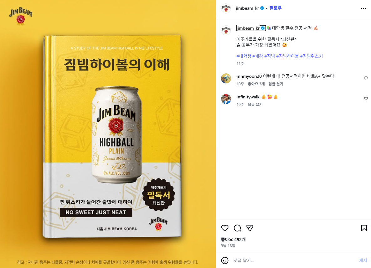 스포츠와 음악 등 MZ 키워드를 확보한 짐빔은 이를 온오프라인 IMC 캠페인으로 효과적으로 전개해 나갔다. 주로 활용한 방법은 온오프라인 바이럴 캠페인과 이벤트, 콜라보 마케팅 등으로 보이며, 이와 함께 주요 MZ 포스트(Post, 장소)에 OOH와 기타 지면광고 등도 진행했을 것이다.