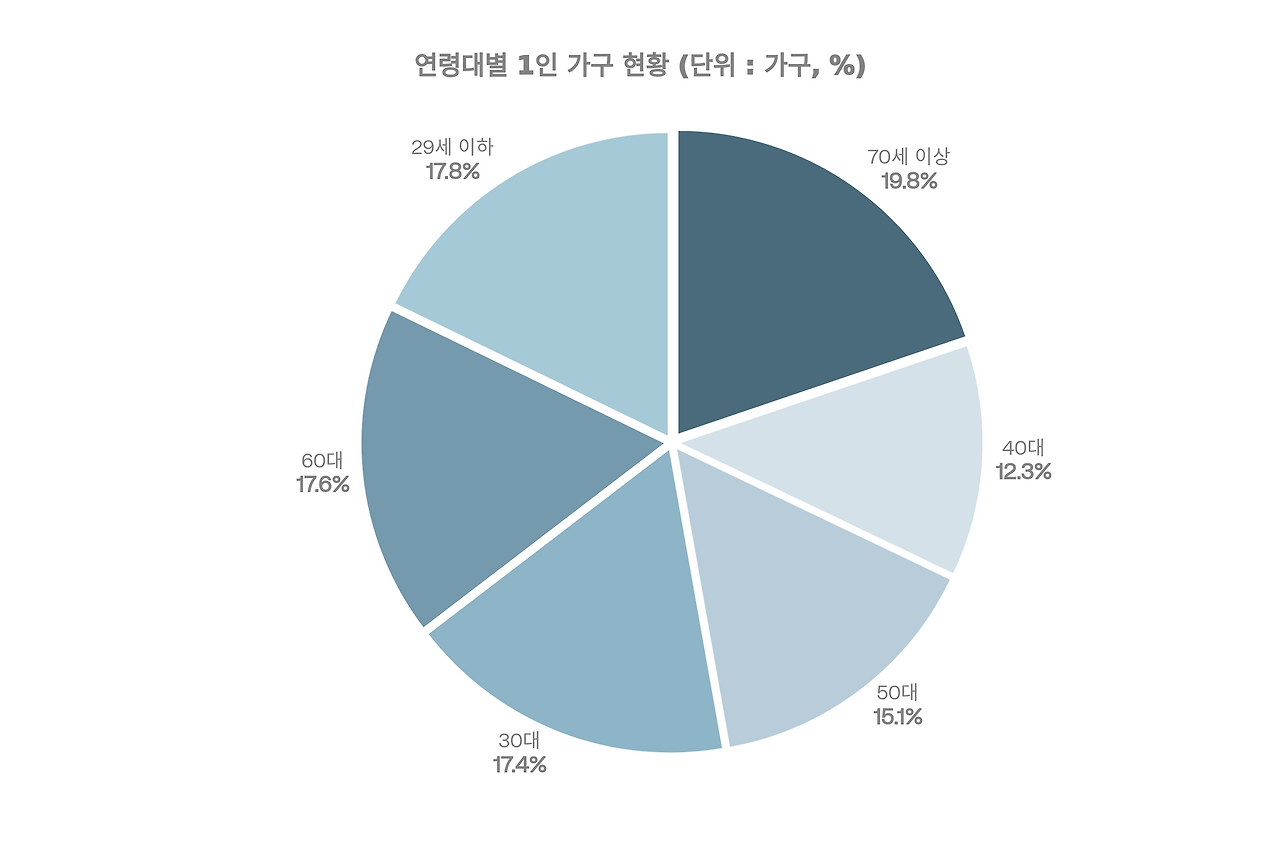 청년층에서도 1인 가구 비중은 압도적으로 높다. 전체 1인 가구 중 29세 이하 가구의 수는 143만 가구로 17.8%, 30대는 140만 4,000가구로 17.4%로 둘을 합하면 무려 35.2%에 달한다. 이는 청년 약 10명 중 3명 이상, 11명 중 4명 내외는 1인 가구라는 것.