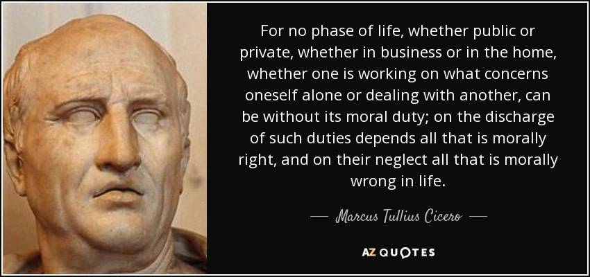 생활의 어떤 부분도 의무에서 벗어날 수가 없으니, 생에 있어서 도덕적으로 옳고 선하고 명예로운 모든 것은 의무를 이행하는 데 달려있고, 도덕적으로 옳지 않고 나쁘며 불명예이며 추한 것은 의무를 이행치 않는 데 있다.