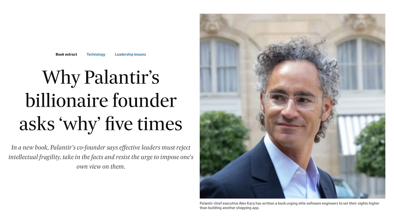 1970년대 말 토요타자동차의 고위 임원이던 오노 다이이치는 자동차 산업의 제조 방식을 혁신한 토요타의 노하우를 설명하는 책을 펴냈다. 오노 다이이치는 이 책에서 근본 원인을 찾는 접근법을 제시했는데, 팔란티어는 약 20년 전부터 이 방식을 채택해 지금까지 활용하고 있다. 이 방법의 핵심은 문제의 발생 원인을 단순히 겉으로 보이는 수준이 아닌 근본적인 수준에서 파헤치는 것이다.