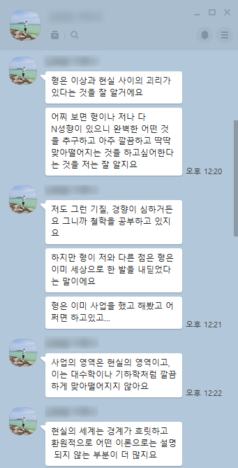 어제 이 글을 적고 몇 명의 친구들에게 카톡이 왔다. "주로 공감이 된다. 글 잘 읽었다." 이런 내용이었다. 그 중에 기억에 남는 내용이 있었는데 현재 고려대 철학과에 재학 중인 HW의 카톡이 그렇다.