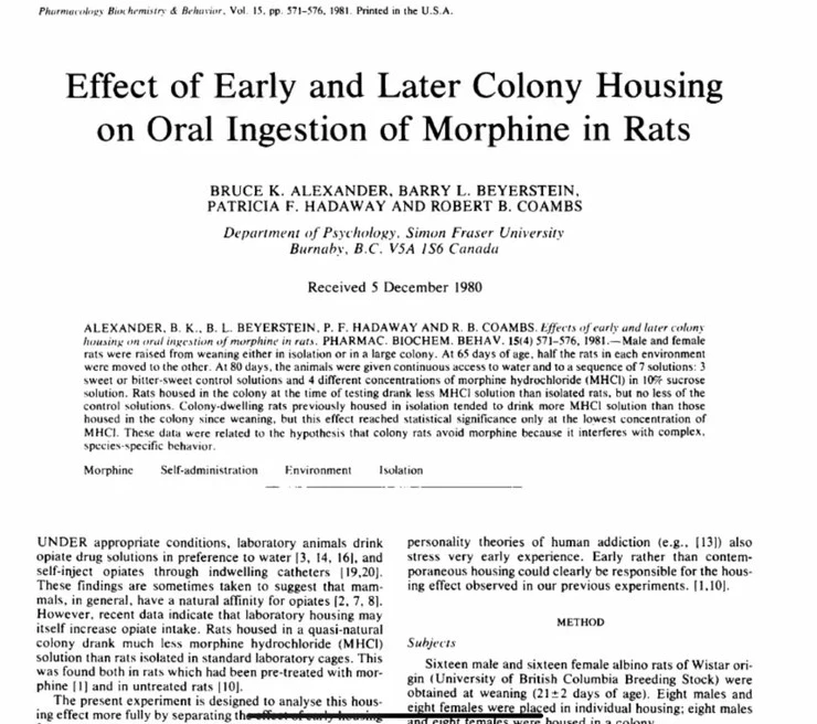 1981년 캐나다의 심리학자 브루스 K 알렉산더가 진행한 쥐 공원(rat park)이라는 연구가 그것이다. 우리는 흔히 아편 / 모르핀 / 코카인 같은 마약에 중독되는 이유를 ‘마약 자체의 성분’ 때문이라 생각한다. 엄청난 중독성을 일으키는 그 내부의 성분이 사람들이 한번이라도 마약에 손대는 순간 다시는 헤어나오지 못할 수렁에 빠뜨린다. 이것이 보통의 인식이다.