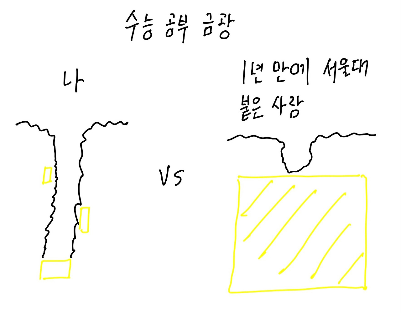 그래서 4년을 공부에 쏟았다. 결과적으로 서울대에 못 갔으니 실패했다. 그 때 내 금광을 그림으로 그려보면 이런 느낌이다.