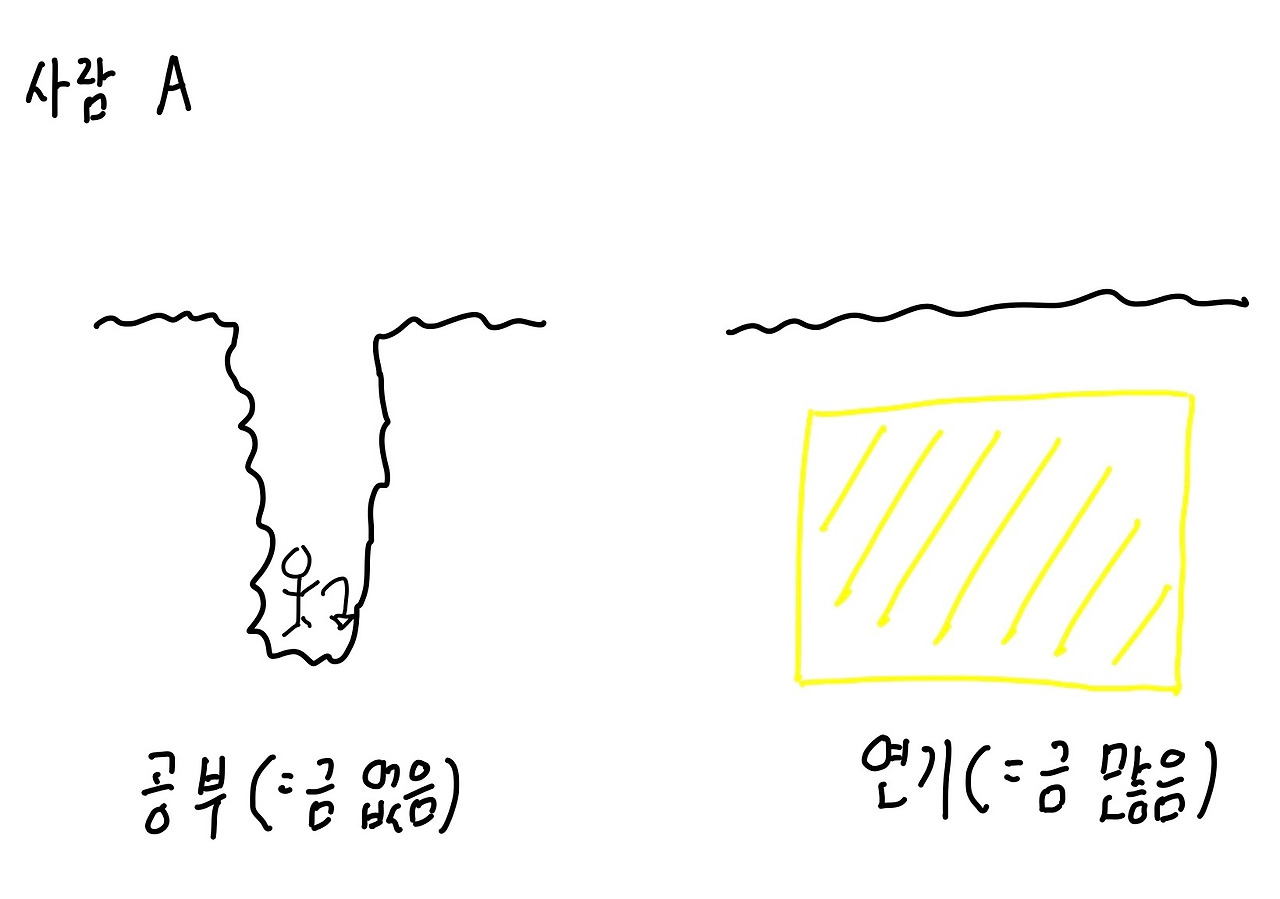 어? 옆 광부도 공부 금광 파서 금 발견했으니깐 나도 더 파면 되겠네?란 생각에 끊지 못하고 죽어라 파는 것이다. 애초에 철수와 영희가 가지고 있던 금광은 자기와는 다른 금광이었다. 묻혀 있는 금(재능)이 그들은 있었지만 A는 없다. 그런데도 그걸 깨닫지 못하고 계속 판다. 웃긴게 이 A 옆에는 금광이 하나 더 있다. 바로 연기라는 분야의 금광이다. A는 평생 연기를 해 본 적이 없다. 공부 금광을 파느라 저런 곳에는 관심조차 없었거든.